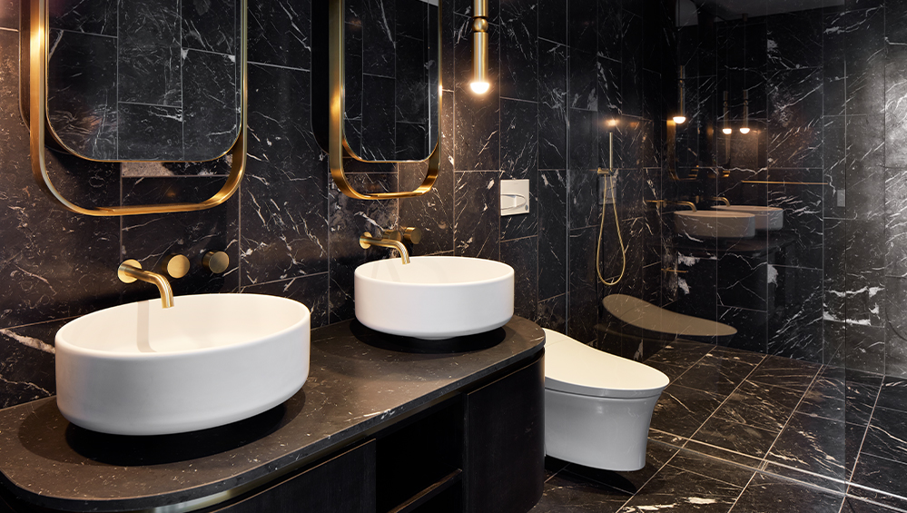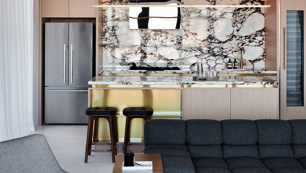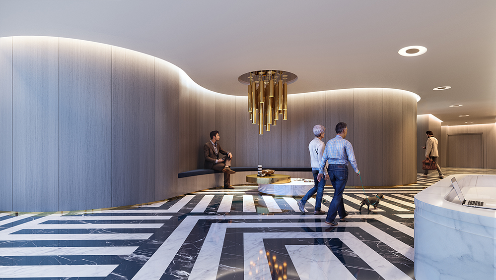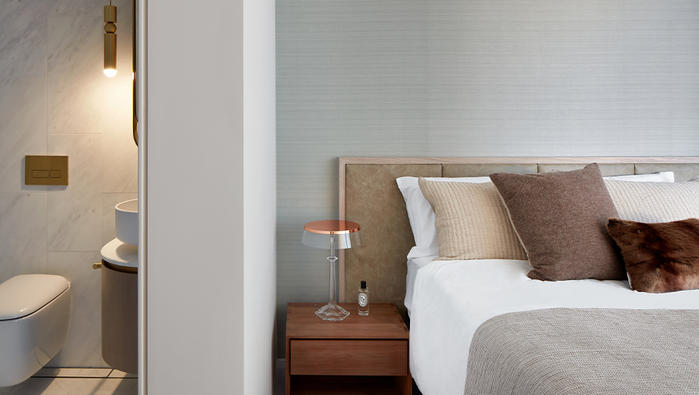 Colours and light bounce from a brass cylindrical chandelier which takes pride of place amongst the lobby’s curved walls and banquet seating, encouraging people to linger and connect with each other. It’s subtle, luxurious and suggests the very rich heritage the location represents for the residents who will be fortunate enough to call this home.