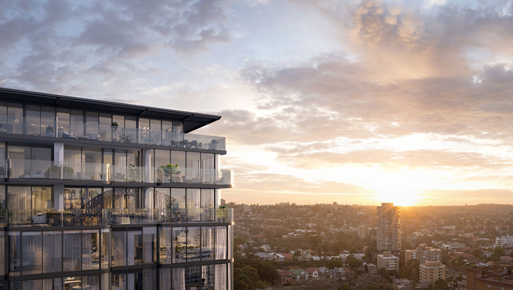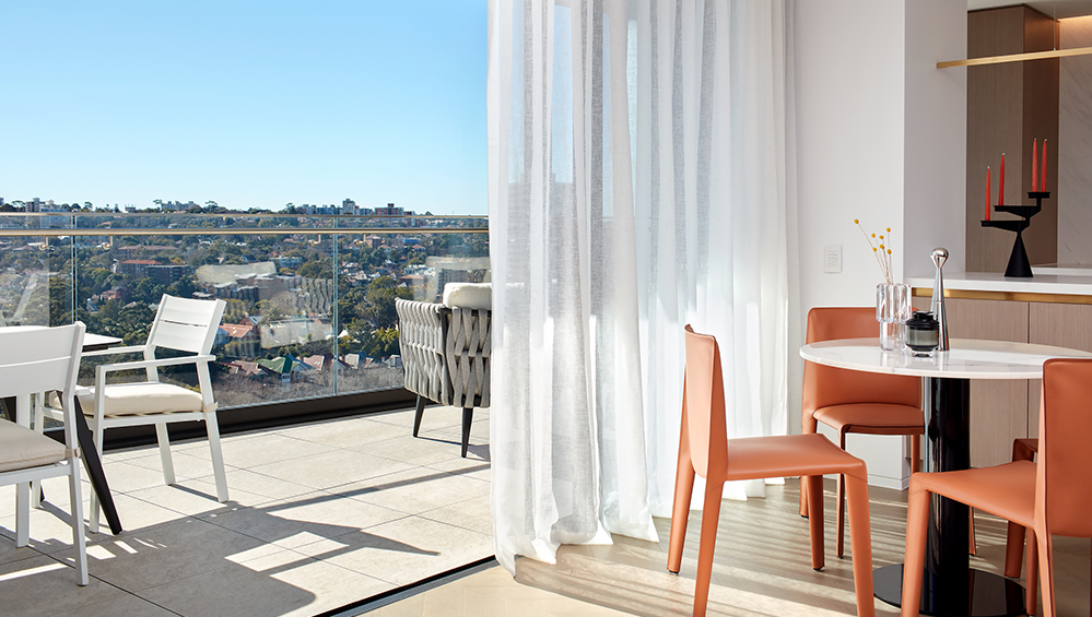 sleek, curved balconies, the bespoke joinery and the fritted glass