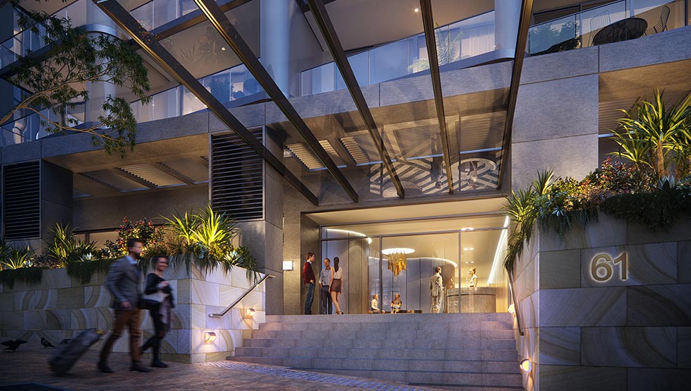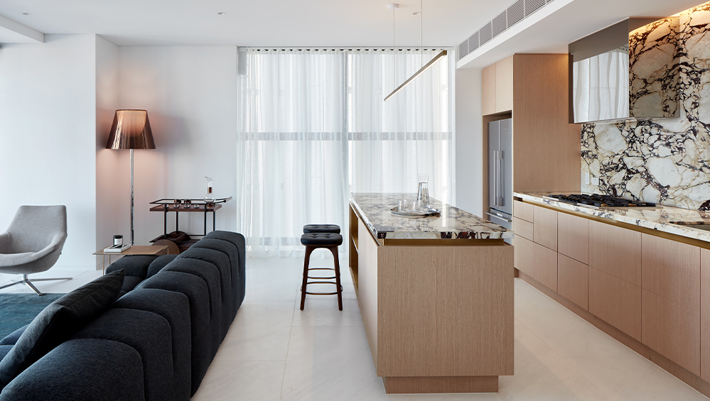 Arrive in style The shared spaces in Blue have been treated with the same care and consideration as the interiors of the apartments. From the expansive glass ceilinged entrance, allowing light to filter through to reflect on the exquisitely designed marble floor, to the brass trim and comfortable seating, the entrance to Blue sets the tone for the finishes in the private living spaces.
